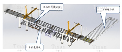工艺流程:叉车移入产品-产品自动流入移载机-移载取板-产品定位自动进入覆膜机-自动覆膜后流入移载机-自动堆垛-顶升转向-进入缓冲区(10米长)-自动流入阻挡位置。