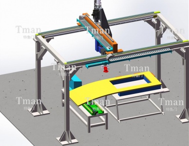 对自动门进行喷涂、毛坯打磨、底漆打磨、腻子打磨、中涂打磨;自动门打磨系统由以下部分组成:喷涂机器人系统;压力调节系统;五轴打磨系统;真空吸台系统;移动支撑平台系统。